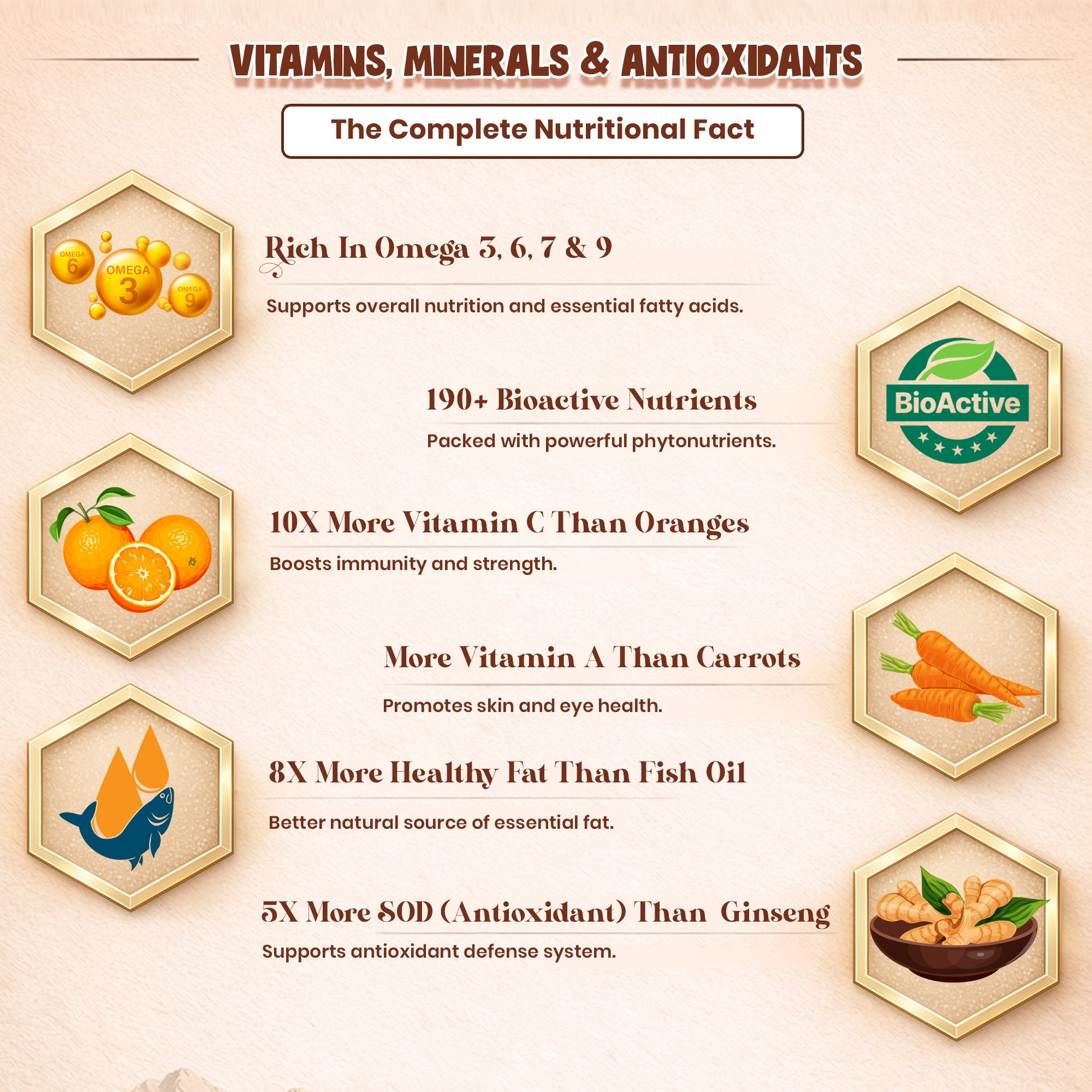 Sea buckthorn (Hippophae rhamnoides L.) is a deciduous shrub of the Elaeagnaceae family native to the cold, arid regions of Asia and Europe, particularly the Himalayas, Tibetan Plateau, and Siberia. The plant produces small orange-yellow berries that are exceptionally rich in bioactive compounds, including carotenoids, tocopherols, flavonoids, phytosterols, and a rare monounsaturated fatty acid known as omega-7 (palmitoleic acid). Over 190 bioactive substances have been identified in sea buckthorn across its berries, seeds, leaves, and bark. It is listed as a medicinal plant by the WHO and recognised by India's Ministry of Ayush for its therapeutic applications in traditional medicine systems.